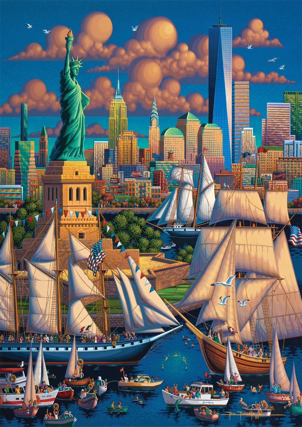 Experience the energy and grandeur of New York City with this stunning Travel America puzzle! Featuring the Statue of Liberty, a fleet of majestic sailing ships, and the iconic Manhattan skyline, this vibrant artwork beautifully captures the spirit of the city that never sleeps.