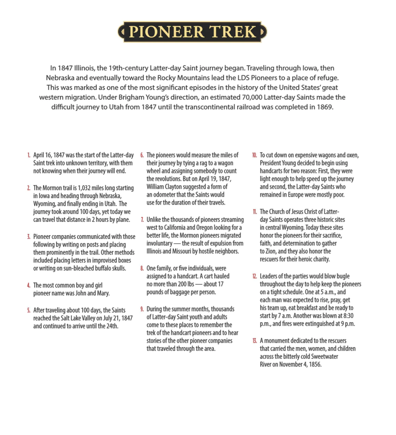 In 1847 Illinois, the 19th-century Latter-day Saint journey began. Traveling through lowa, then Nebraska and eventually toward the Rocky Mountains lead the LDS Pioneers to a place of refuge. This was marked as one of the most significant episodes in the history of the United States' great western migration. Under Brigham Young's direction, an estimated 70,000 Latter-day Saints made the difficult journey to Utah from 1847 until the transcontinental railroad was completed in 1869.