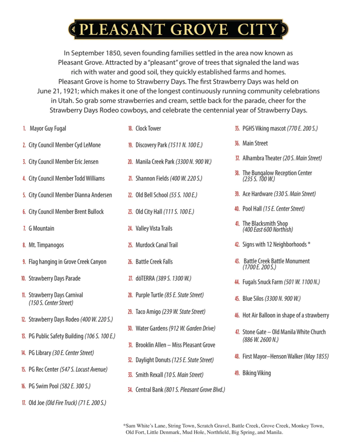 rich with water and good soil, they quickly established farms and homes. Pleasant Grove is home to Strawberry Days. The first Strawberry Days was held on June 21, 1921; which makes it one of the longest continuously running community celebrations in Utah. So grab some strawberries and cream, settle back for the parade, cheer for the Strawberry Days Rodeo cowboys, and celebrate the centennial year of Strawberry Days.