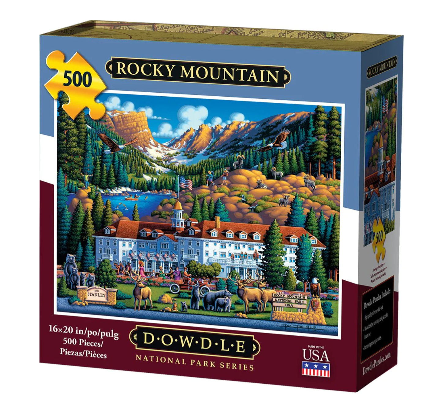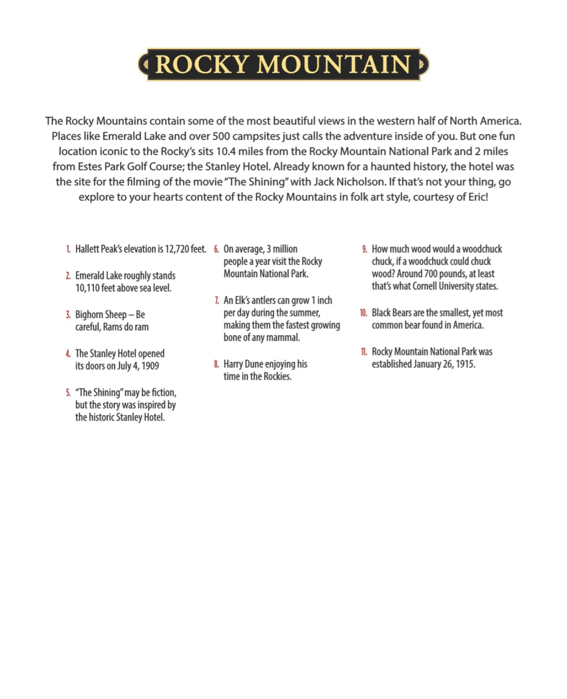 The Rocky Mountains contain some of the most beautiful views in the western half of North America. Places like Emerald Lake and over 500 campsites just calls the adventure inside of you. But one fun location iconic to the Rocky's sits 10.4 miles from the Rocky Mountain National Park and 2 miles from Estes Park Golf Course; the Stanley Hotel. Already known for a haunted history, the hotel was the site for the filming of the movie "The Shining" with Jack Nicholson. If that's not your thing, go explore to your hearts content of the Rocky Mountains in folk art style, courtesy of Eric!