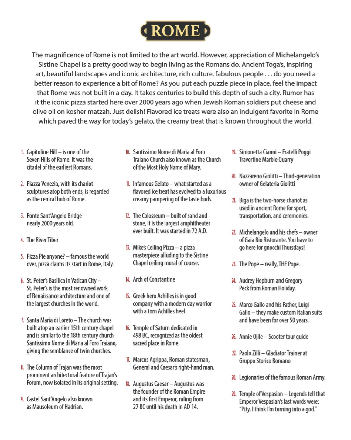 The magnificence of Rome is not limited to the art world. However, appreciation of Michelangelo's Sistine Chapel is a pretty good way to begin living as the Romans do. Ancient Toga's, inspiring art, beautiful landscapes and iconic architecture, rich culture, fabulous people... do you need a better reason to experience a bit of Rome? As you put each puzzle piece in place, feel the impact that Rome was not built in a day. It takes centuries to build this depth of such a city. Rumor has it the iconic pizza started here over 2000 years ago when Jewish Roman soldiers put cheese and olive oil on kosher matzah. Just delish! Flavored ice treats were also an indulgent favorite in Rome which paved the way for today's gelato, the creamy treat that is known throughout the world.