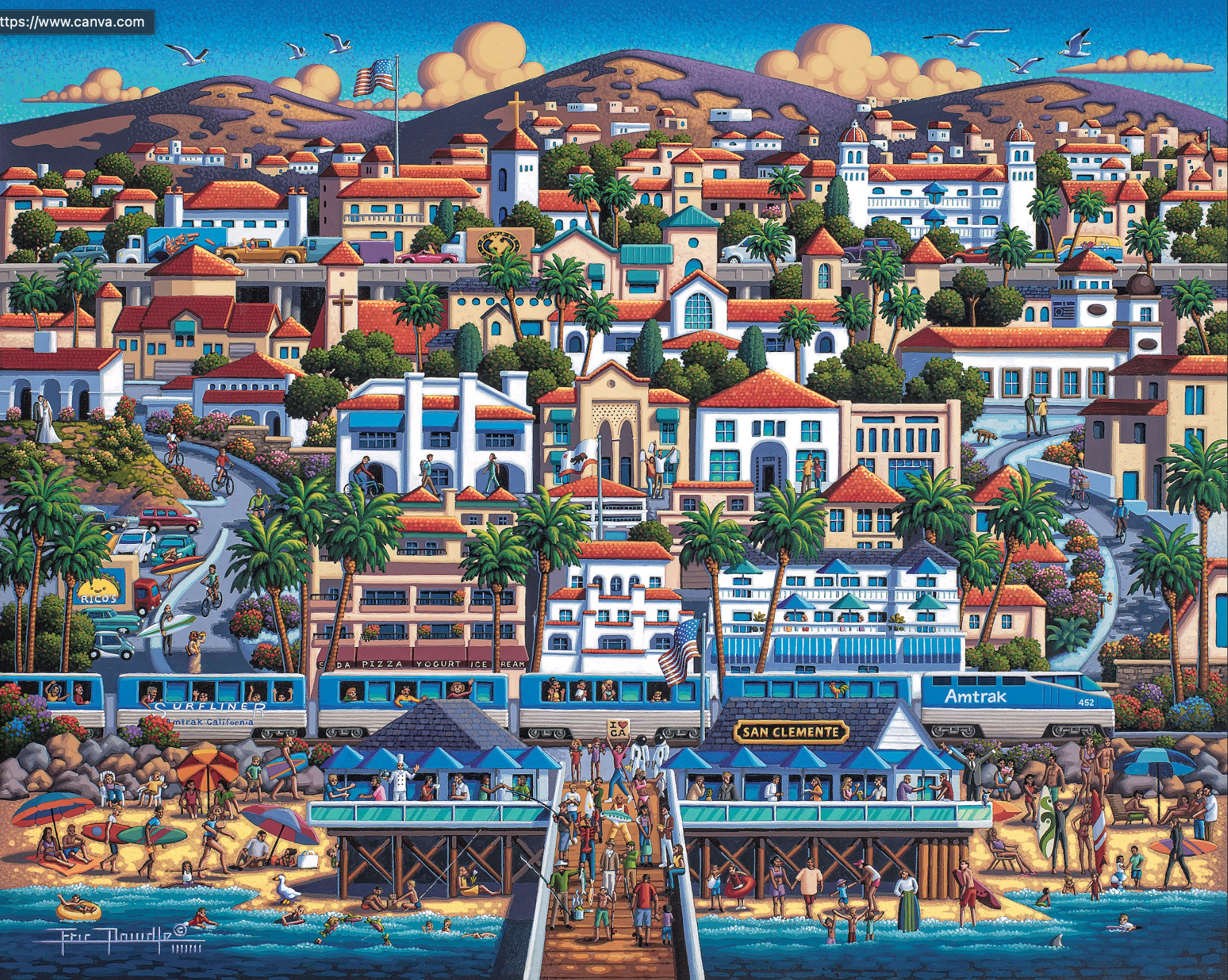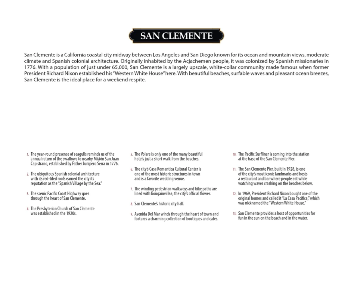 San Clemente is a California coastal city midway between Los Angeles and San Diego known for its ocean and mountain views, moderate climate and Spanish colonial architecture. Originally inhabited by the Acjachemen people, it was colonized by Spanish missionaries in 1776. With a population of just under 65,000, San Clemente is a largely upscale, white-collar community made famous when former President Richard Nixon established his "Western White House" here. With beautiful beaches, surfable waves and pleasant ocean breezes, San Clemente is the ideal place for a weekend respite.