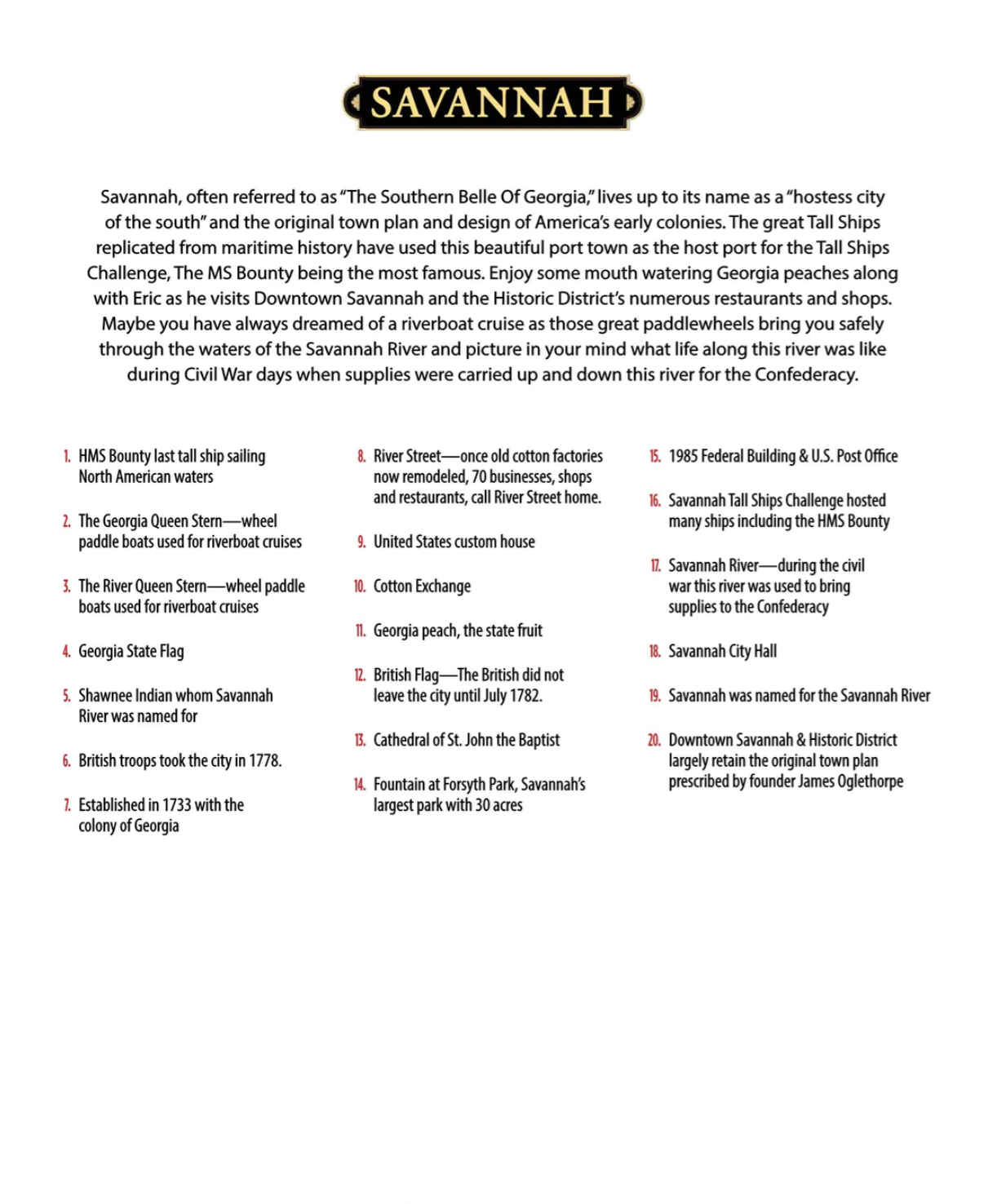 Savannah, often referred to as "The Southern Belle Of Georgia, lives up to its name as a "hostess city of the south" and the original town plan and design of America's early colonies. The great Tall Ships replicated from maritime history have used this beautiful port town as the host port for the Tall Ships Challenge, The MS Bounty being the most famous. Enjoy some mouthwatering Georgia peaches along with Eric as he visits Downtown Savannah and the Historic District's numerous restaurants and shops. Maybe you have always dreamed of a riverboat cruise as those great paddlewheels bring you safely through the waters of the Savannah River and picture in your mind what life along this river was like during Civil War days when supplies were carried up and down this river for the Confederacy.