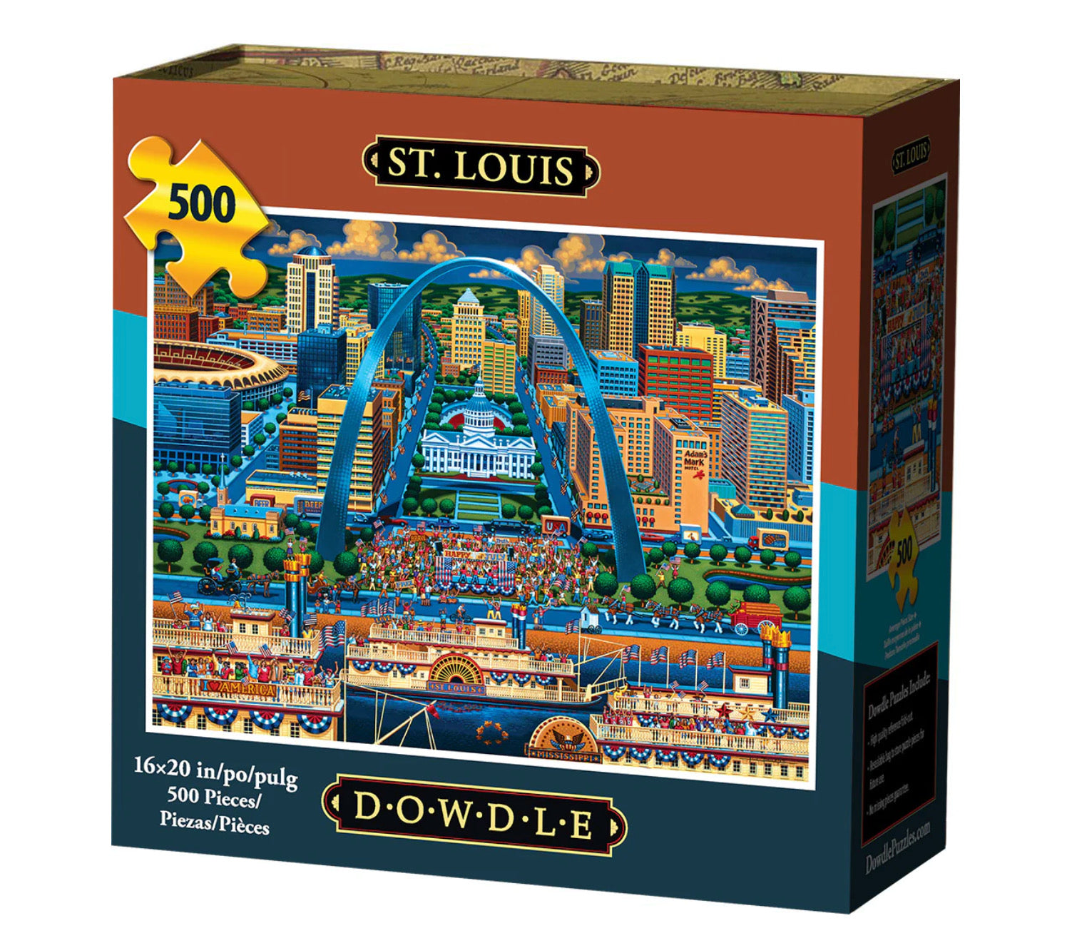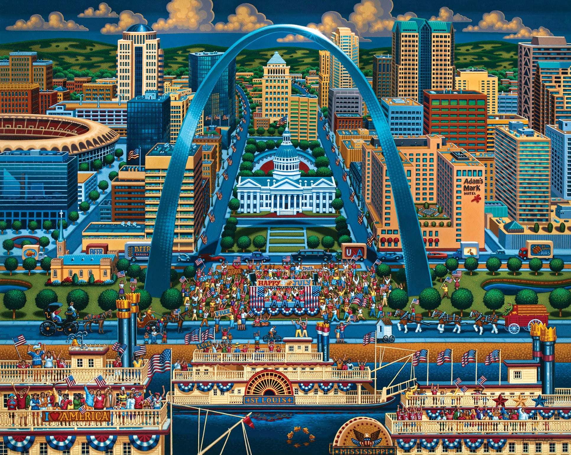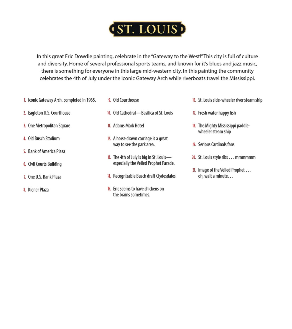 In this great Eric Dowdle painting, celebrate in the "Gateway to the West!" This city is full of culture and diversity. Home of several professional sports teams, and known for it's blues and jazz music, there is something for everyone in this large mid-western city. In this painting the community celebrates the 4th of July under the iconic Gateway Arch while riverboats travel the Mississippi.