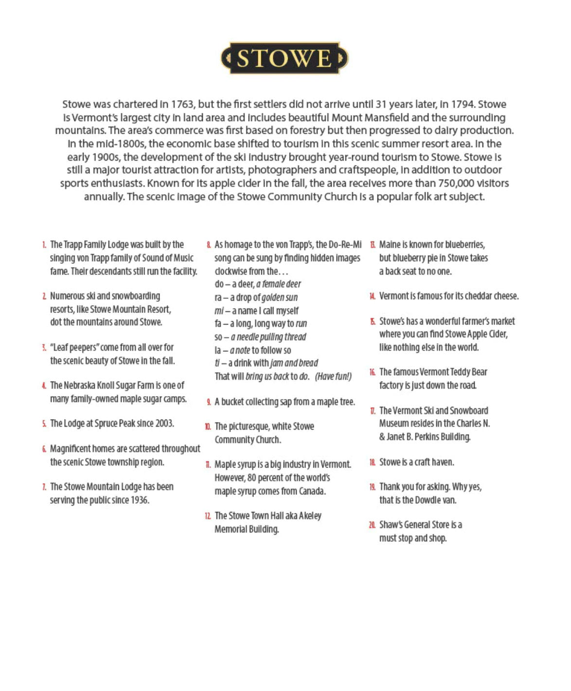 Stowe was chartered in 1763, but the first settlers did not arrive until 31 years later, in 1794. Stowe Is Vermont's largest city in land area and includes beautiful Mount Mansfield and the surrounding mountains. The area's commerce was first based on forestry but then progressed to dairy production. In the mid-1800s, the economic base shifted to tourism in this scenic summer resort area. In the early 1900s, the development of the ski industry brought year-round tourism to Stowe. Stowe is still a major tourist attraction for artists, photographers and craftspeople, in addition to outdoor sports enthusiasts. Known for its apple cider in the fall, the area receives more than 750,000 visitors annually. The scenic image of the Stowe Community Church is a popular folk art subject.