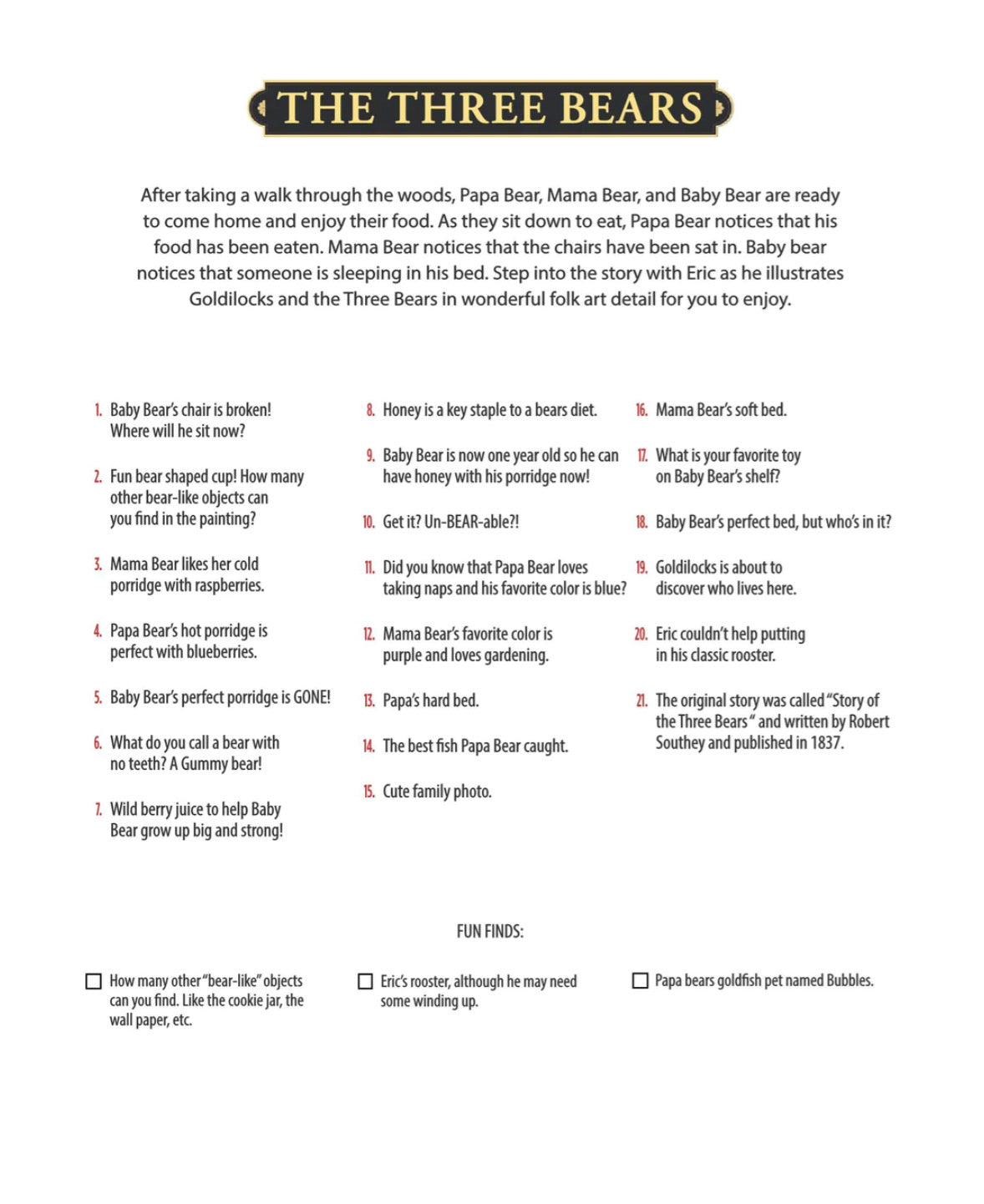 After taking a walk through the woods, Papa Bear, Mama Bear, and Baby Bear are ready to come home and enjoy their food. As they sit down to eat, Papa Bear notices that his food has been eaten. Mama Bear notices that the chairs have been sat in. Baby bear notices that someone is sleeping in his bed. Step into the story with Eric as he illustrates Goldilocks and the Three Bears in wonderful folk art detail for you to enjoy.