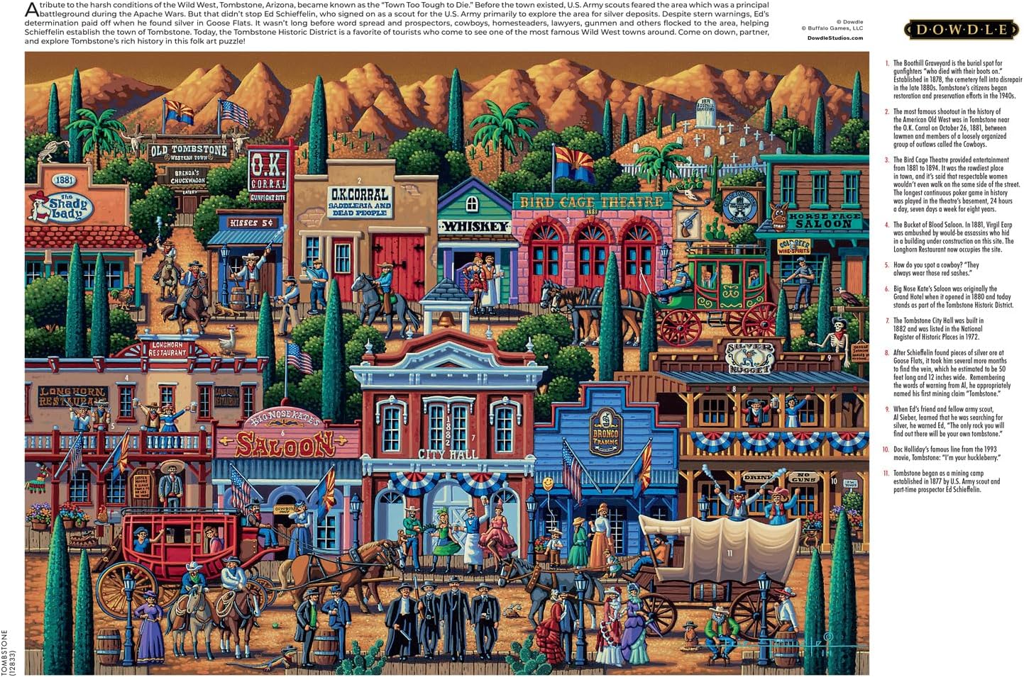 In order to survive the harsh conditions of the Wild West, the one place you must visit is Tombstone, Arizona. Also known as "The Town Too Tough To Die!" Before the city even existed, the U.S. Army Scouts feared the area, thanks to Indians killing three superintendents in the 1870's. But that didn't stop Ed Schieffelin, a scout for the U.S. Army, exploring the area for valuables, especially silver. Despite all of the warnings, Ed's luck paid off when he found silver in Goose Flats, and it wasn't long before word spread about his findings. Soon prospectors, cowboys, homesteaders, lawyers, gunmen, and many more people flocked to the area, helping Schieffelin to create the town of Tombstone. Today, the historic district is still a favorite among Tombstone visitors as well as seeing one of the most famous Wild West towns around. Come on down partner and explore Tombstone's rich history in this folk-art puzzle!