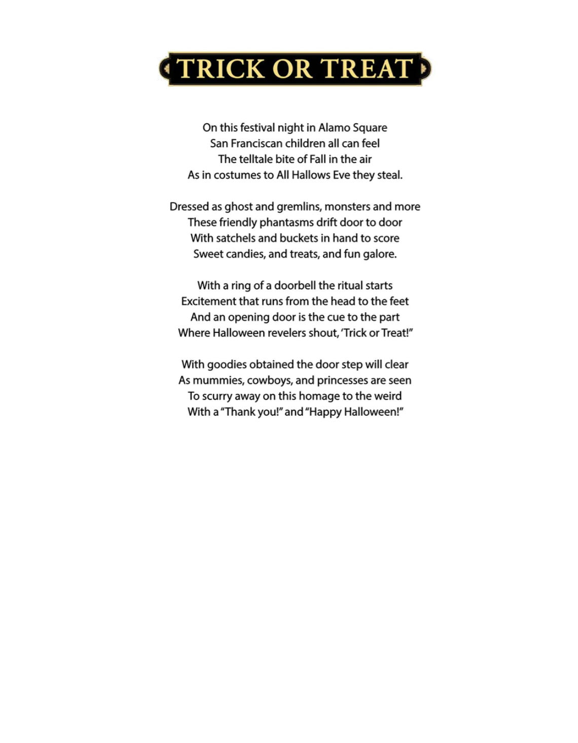 Dressed as ghost and gremlins, monsters and more These friendly phantasms drift door to door With satchels and buckets in hand to score Sweet candies, and treats, and fun galore.