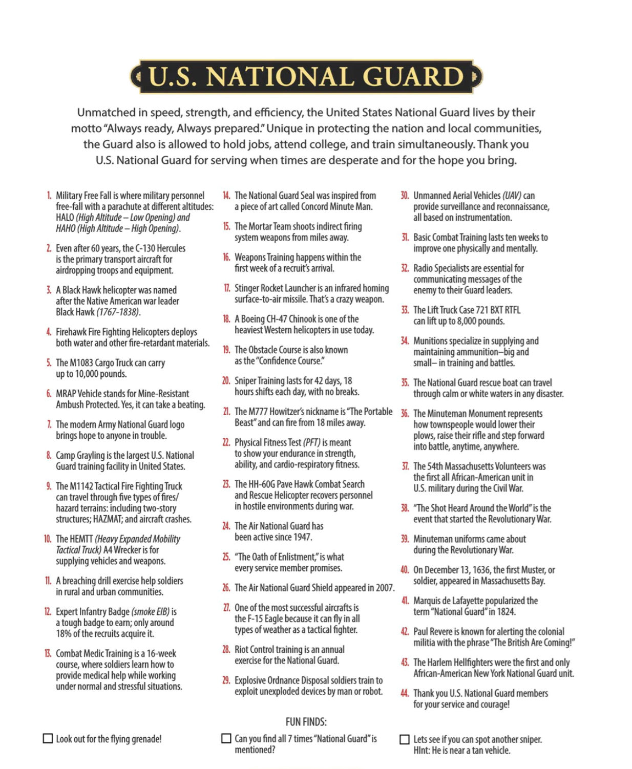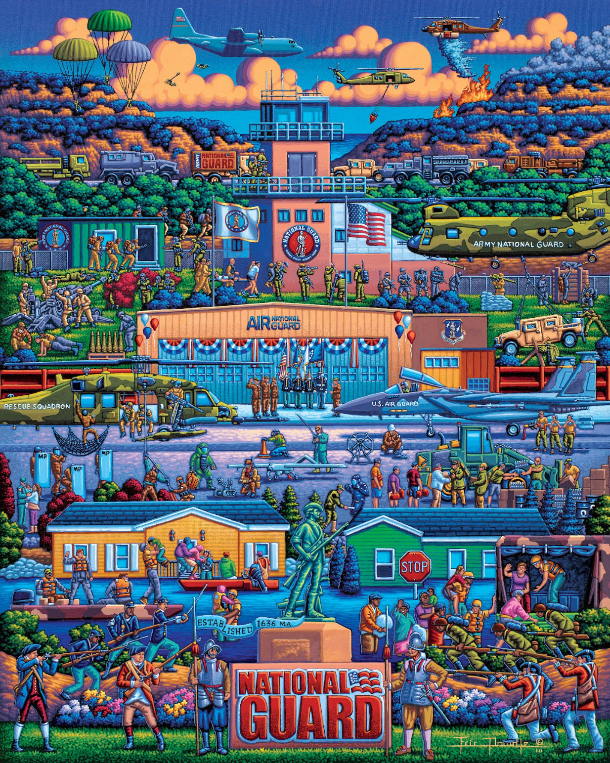 Unmatched in speed, strength, and efficiency, the United States National Guard lives by their motto "Always ready, Always prepared." Unique in protecting the nation and local communities, the Guard also is allowed to hold jobs, attend college, and train simultaneously. Thank you U.S. National Guard for serving when times are desperate and for the hope you bring.