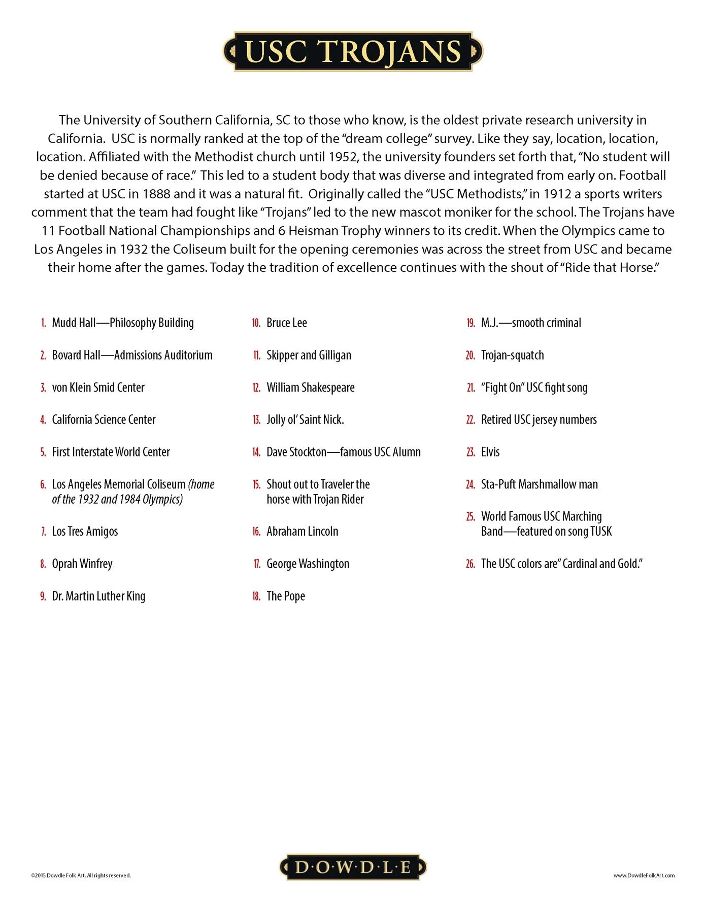 The University of Southern California, SC to those who know, is the oldest private research university in California. USC is normally ranked at the top of the “dream college” survey. Like they say, location, location, location. Affiliated with the Methodist church until 1952, the university founders set forth that, “No student will be denied because of race.” This led to a student body that was diverse and integrated from early on. Football started at USC in 1888, and it was a natural fit. Originally called the “USC Methodists,” in 1912 a sports writer's comment that the team had fought like “Trojans” led to the new mascot moniker for the school. The Trojans have 11 Football National Championships and 6 Heisman Trophy winners to its credit. When the Olympics came to Los Angeles in 1932 the Coliseum built for the opening ceremonies was across the street from USC and became their home after the games. Today the tradition of excellence continues with the shout of “Ride that Horse.”