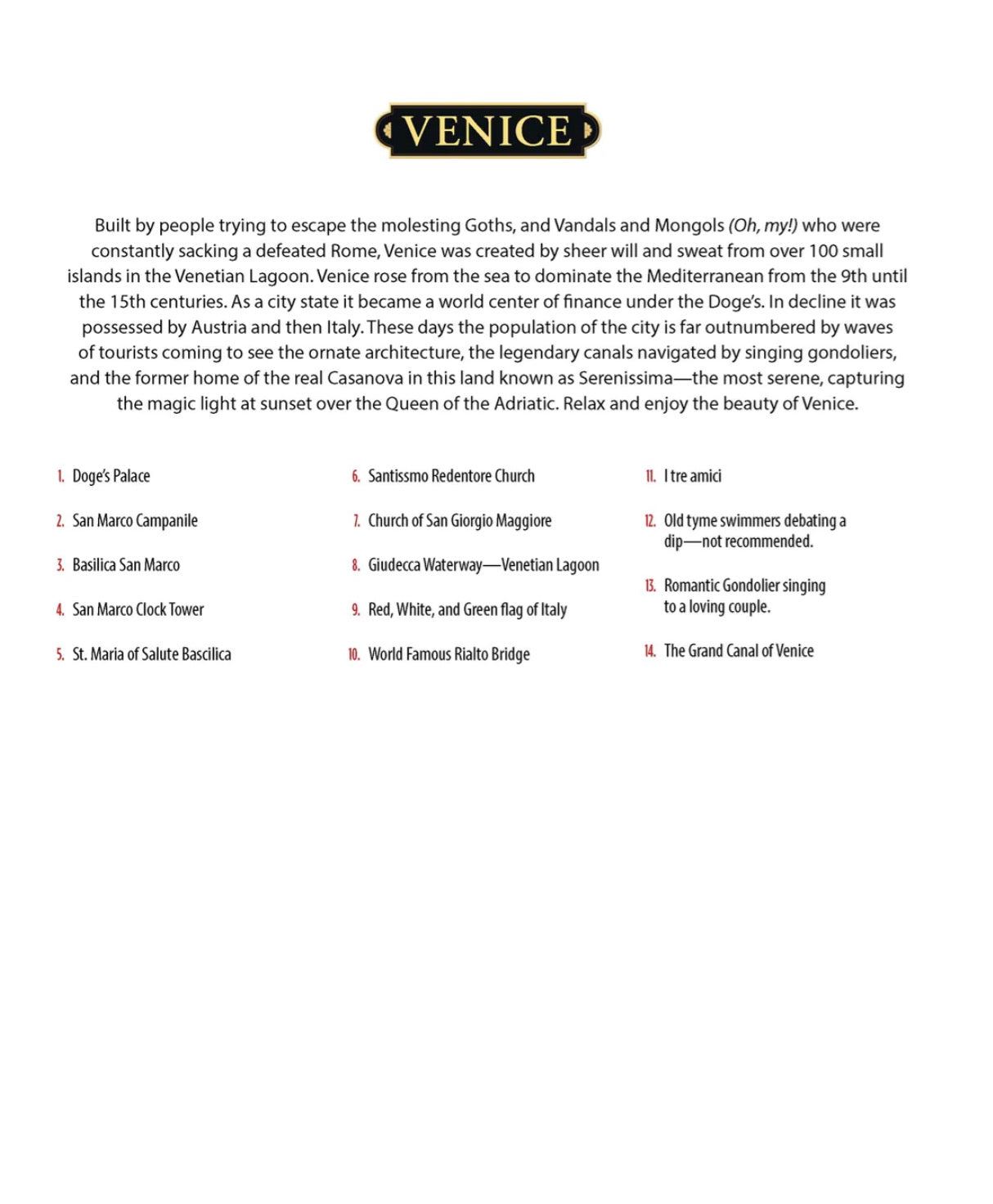 Built by people trying to escape the molesting Goths, and Vandals and Mongols (Oh, my!) who were constantly sacking a defeated Rome, Venice was created by sheer will and sweat from over 100 small islands in the Venetian Lagoon. Venice rose from the sea to dominate the Mediterranean from the 9th until the 15th centuries. As a city state it became a world center of finance under the Doge's. In decline it was possessed by Austria and then Italy. These days the population of the city is far outnumbered by waves of tourists coming to see the ornate architecture, the legendary canals navigated by singing gondoliers, and the former home of the real Casanova in this land known as Serenissima-the most serene, capturing the magic light at sunset over the Queen of the Adriatic. Relax and enjoy the beauty of Venice.