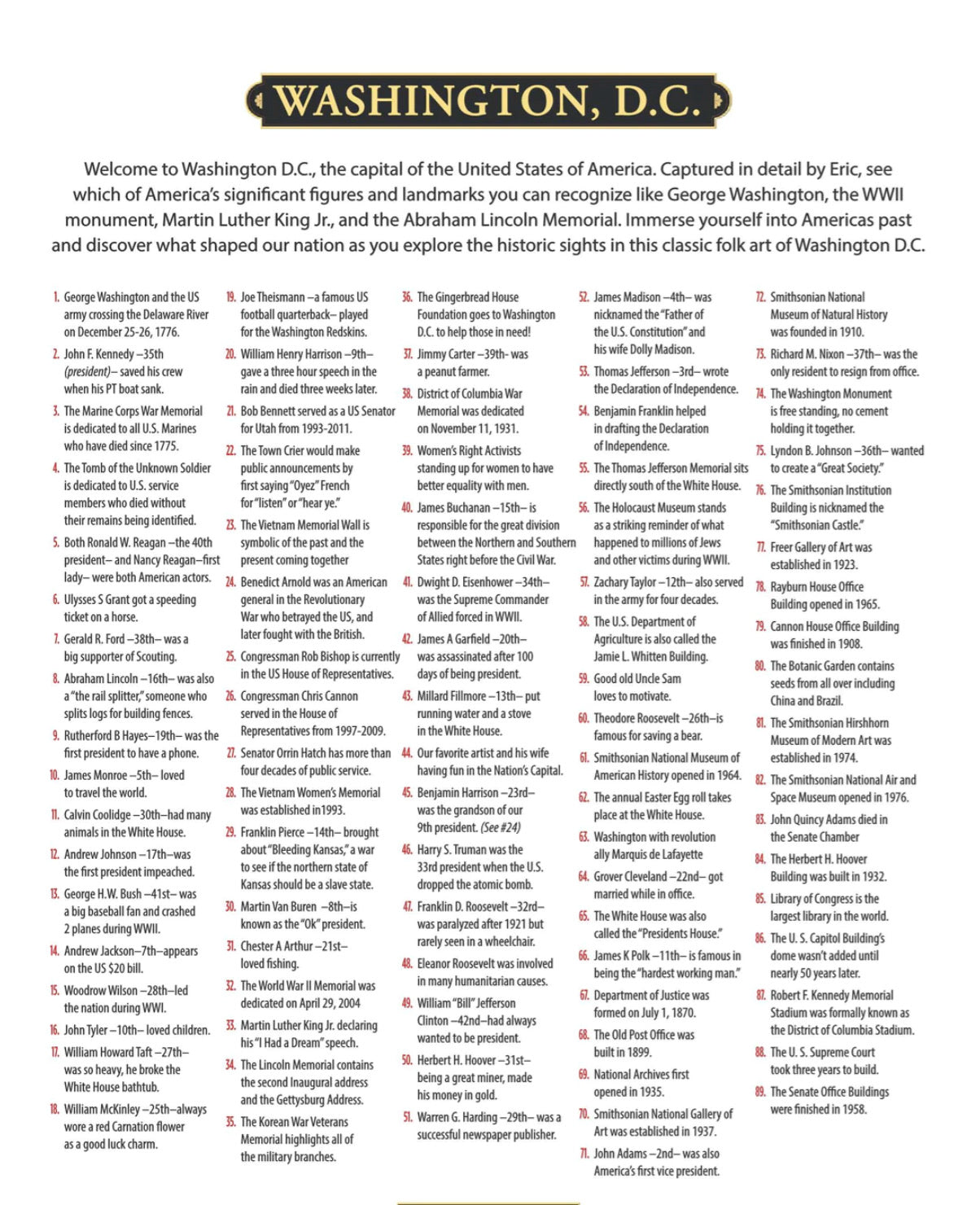 Welcome to Washington D.C., the capital of the United States of America. Captured in detail by Eric, see which of America's significant figures and landmarks you can recognize like George Washington, the WWII monument, Martin Luther King Jr., and the Abraham Lincoln Memorial. Immerse yourself into Americas past and discover what shaped our nation as you explore the historic sights in this classic folk art of Washington D.C.