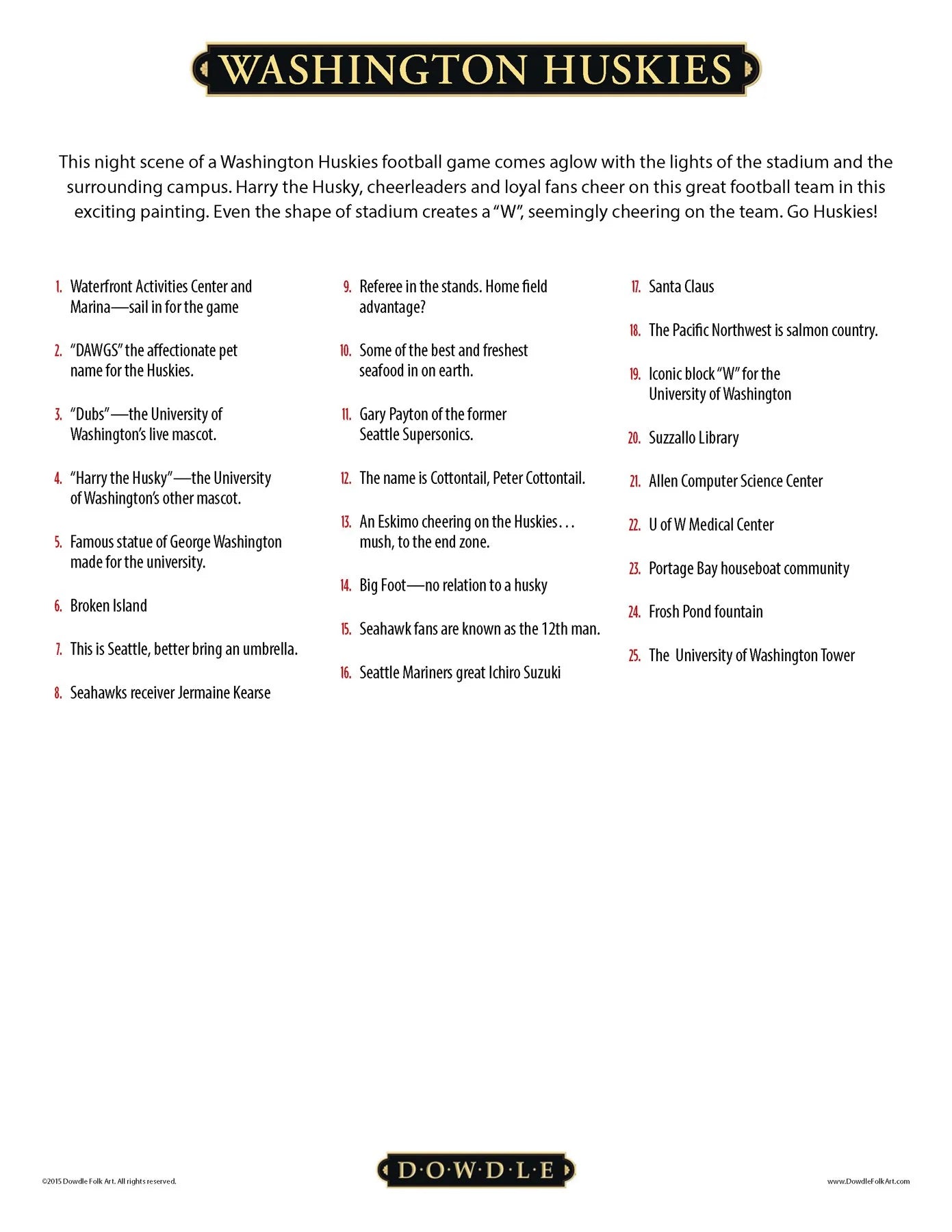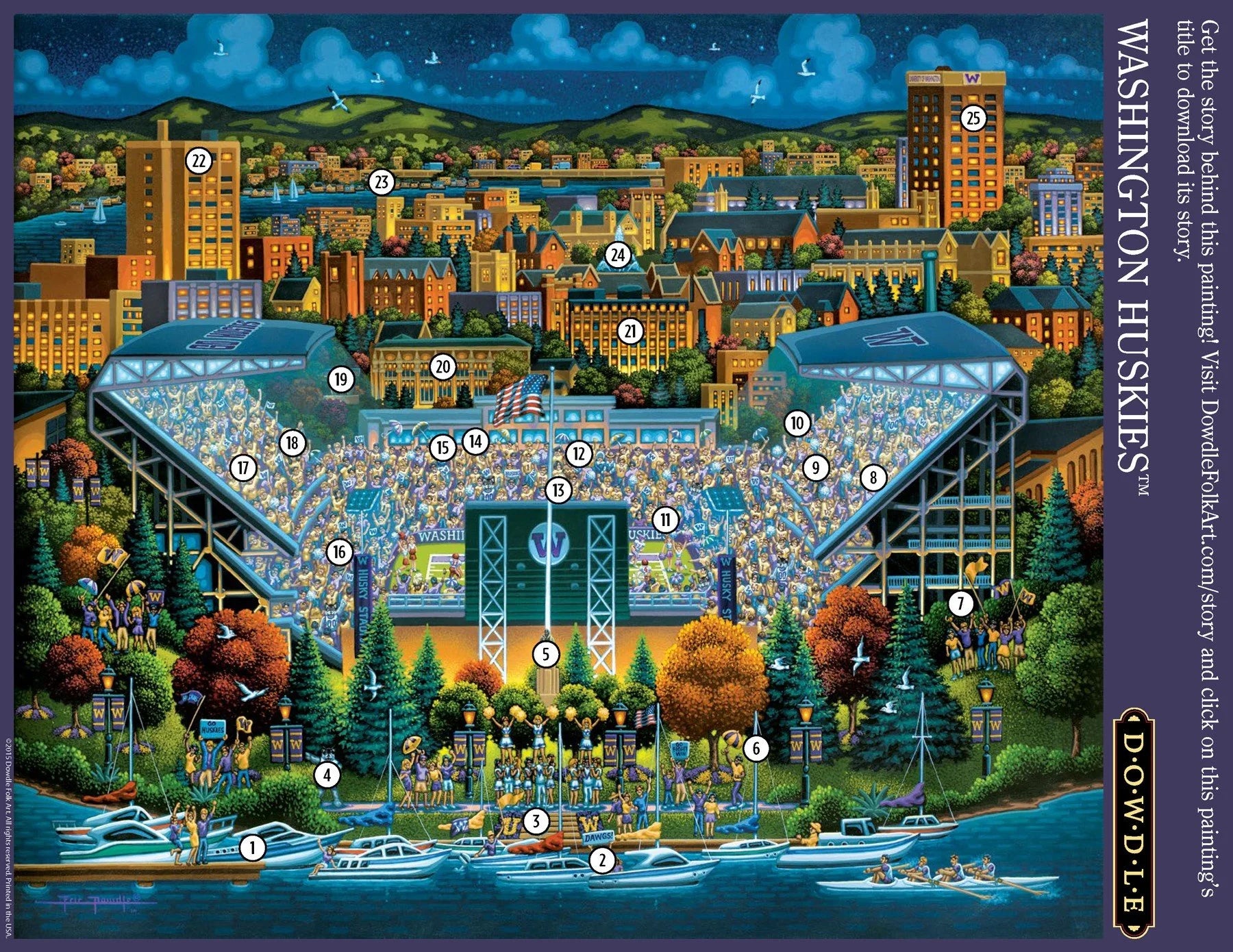 This night scene of a Washington Huskies football game comes aglow with the lights of the stadium and the surrounding campus. Harry the Husky, cheerleaders and loyal fans cheer on this great football team in this exciting painting. Even the shape of stadium creates a "W", seemingly cheering on the team. Go Huskies!