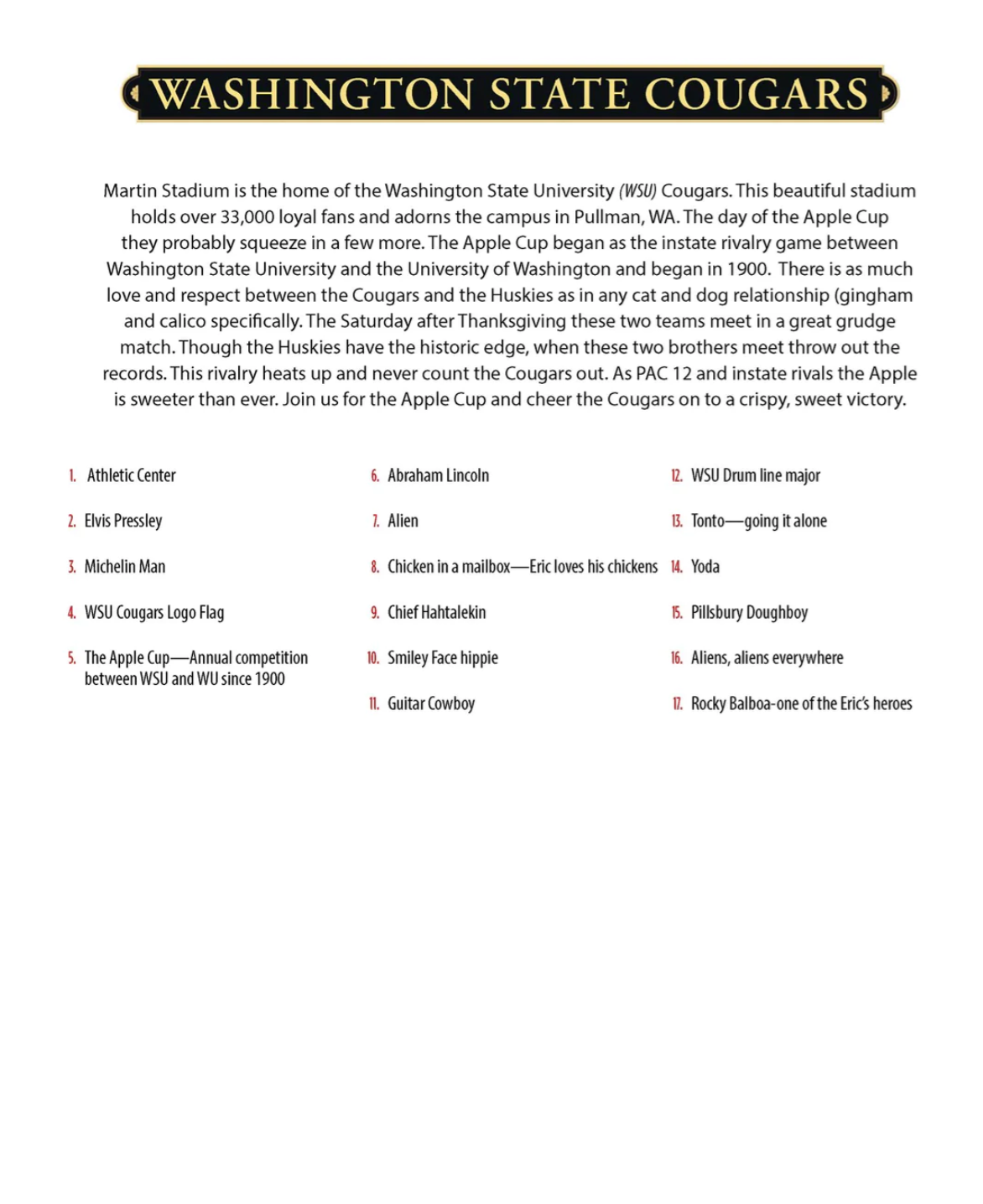 Martin Stadium is the home of the Washington State University (WSU) Cougars. This beautiful stadium holds over 33,000 loyal fans and adorns the campus in Pullman, WA. The day of the Apple Cup they probably squeeze in a few more. The Apple Cup began as the instate rivalry game between Washington State University and the University of Washington and began in 1900. There is as much love and respect between the Cougars and the Huskies as in any cat and dog relationship (gingham and calico specifically. The Saturday after Thanksgiving these two teams meet in a great grudge match. Though the Huskies have the historic edge, when these two brothers meet throw out the records. This rivalry heats up and never count the Cougars out. As PAC 12 and instate rivals the Apple is sweeter than ever. Join us for the Apple Cup and cheer the Cougars on to a crispy, sweet victory.