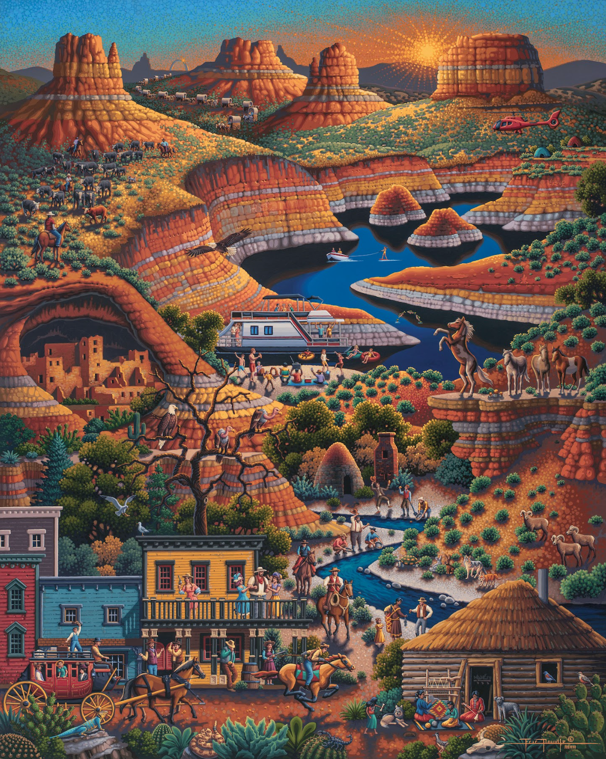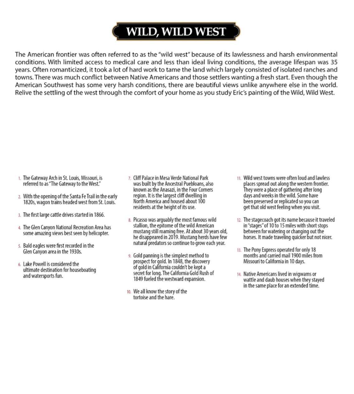 The American frontier was often referred to as the "wild west" because of its lawlessness and harsh environmental conditions. With limited access to medical care and less than ideal living conditions, the average lifespan was 35 years. Often romanticized, it took a lot of hard work to tame the land which largely consisted of isolated ranches and towns. There was much conflict between Native Americans and those settlers wanting a fresh start. Even though the American Southwest has some very harsh conditions, there are beautiful views unlike anywhere else in the world. Relive the settling of the west through the comfort of your home as you study Eric's painting of the Wild, Wild West.