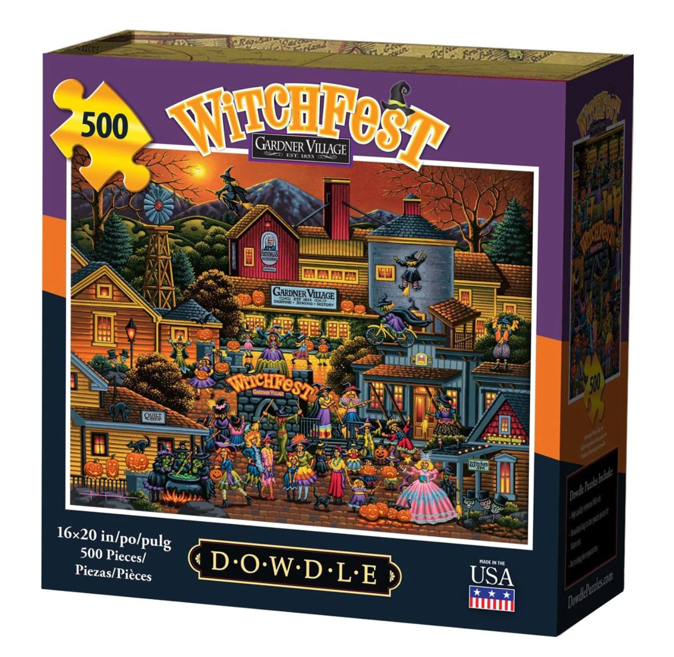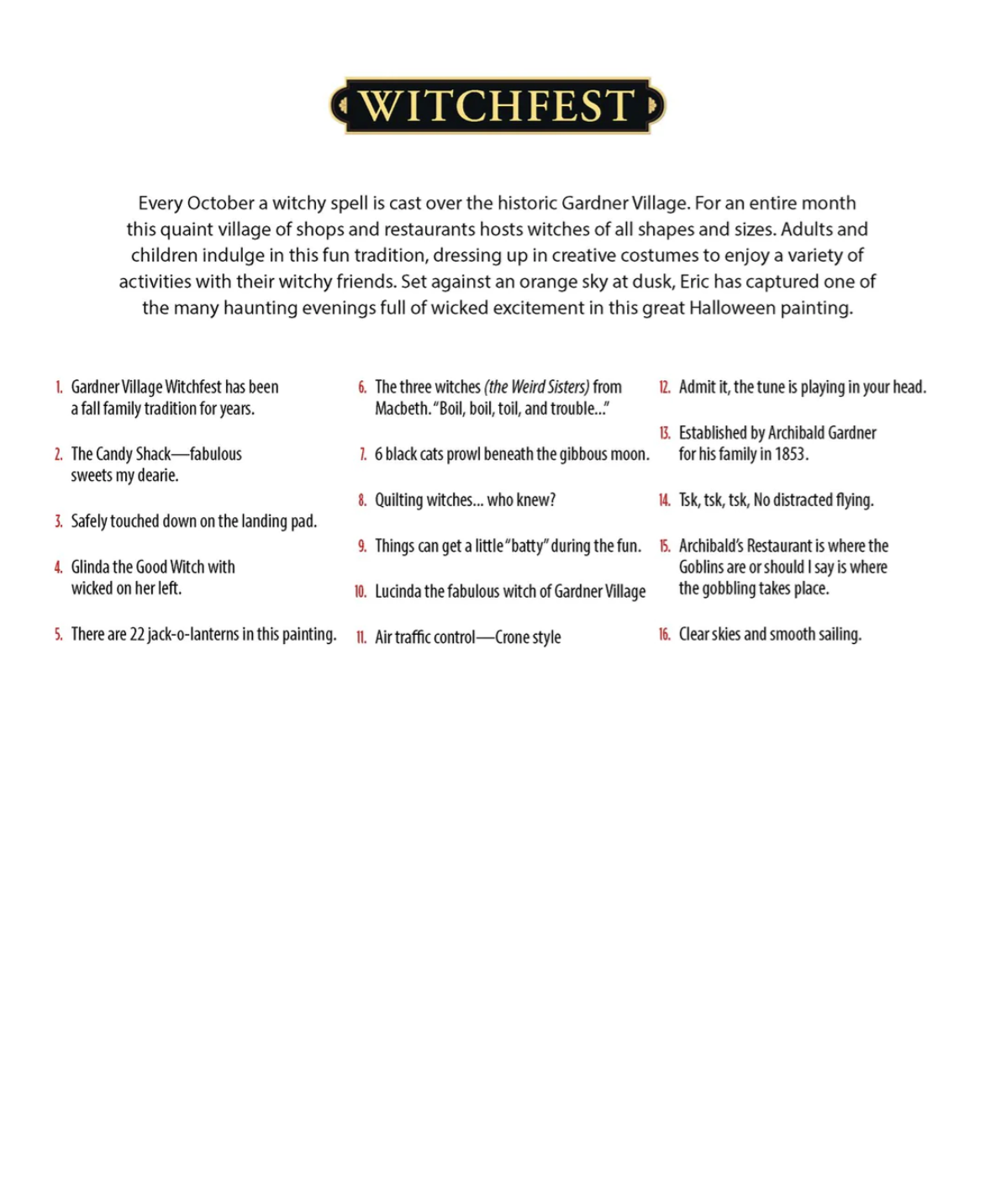 Every October a witchy spell is cast over the historic Gardner Village. For an entire month this quaint village of shops and restaurants hosts witches of all shapes and sizes. Adults and children indulge in this fun tradition, dressing up in creative costumes to enjoy a variety of activities with their witchy friends. Set against an orange sky at dusk, Eric has captured one of the many haunting evenings full of wicked excitement in this great Halloween painting.