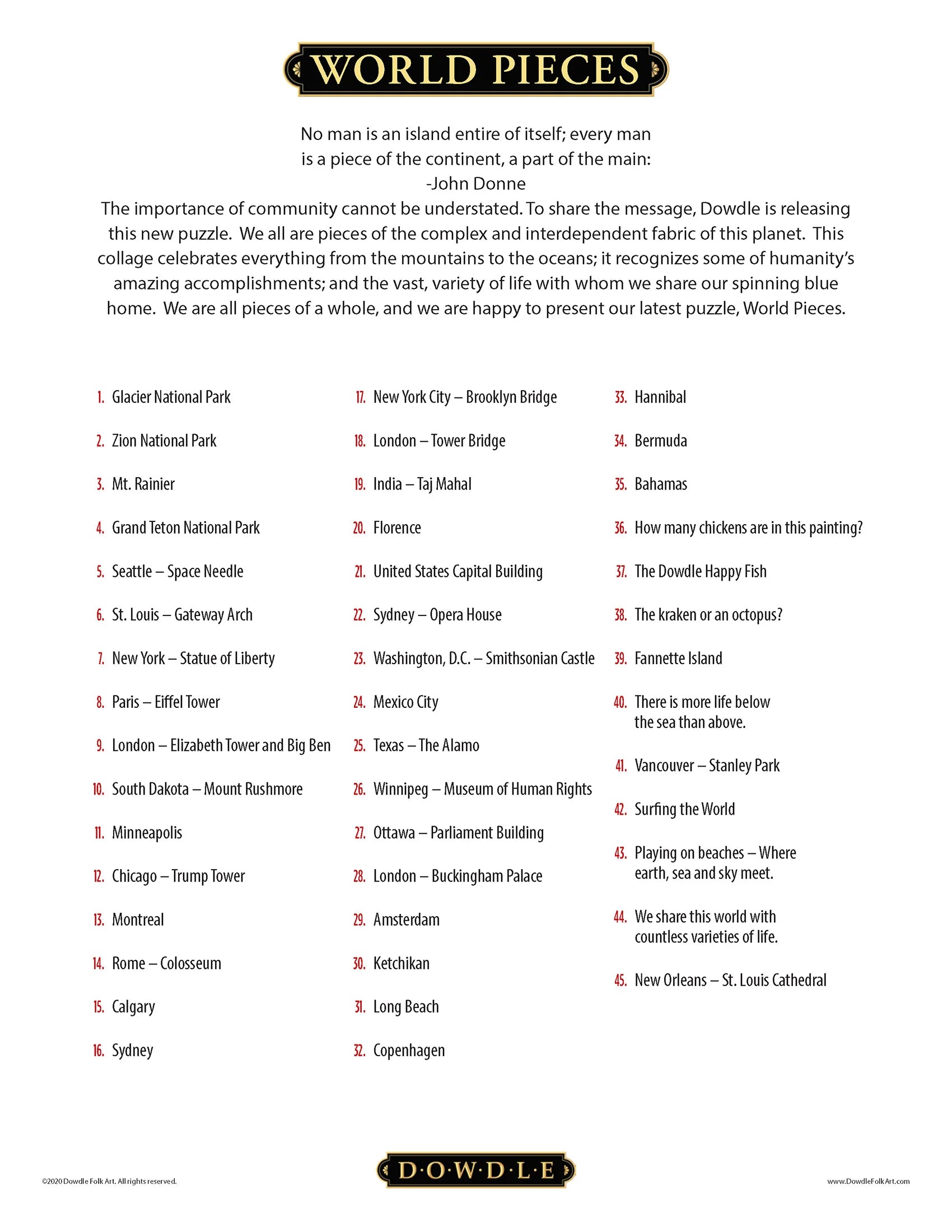 The importance of community cannot be understated. To share the message, Dowdle is releasing this new puzzle. We all are pieces of the complex and interdependent fabric of this planet. This collage celebrates everything from the mountains to the oceans; it recognizes some of humanity’s amazing accomplishments; and the vast, variety of life with whom we share our spinning blue home. We are all pieces of a whole, and we are happy to present our latest puzzle, World Pieces.