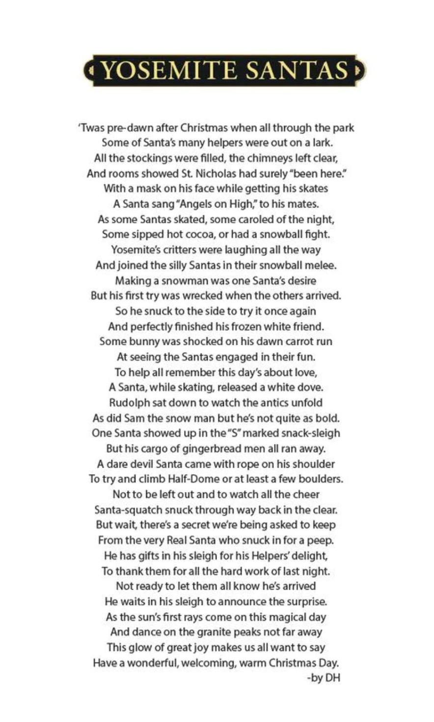 Join Santa's special helper elves, frolicking at the base of majestic Half Dome as the morning's first magical rays light the summit. This great new collectible painting has a fun poem to accompany it to tell the Santas' stories. "Have a wonderful, welcoming, warm Christmas ' Day," and come play with Yosemite Santas!